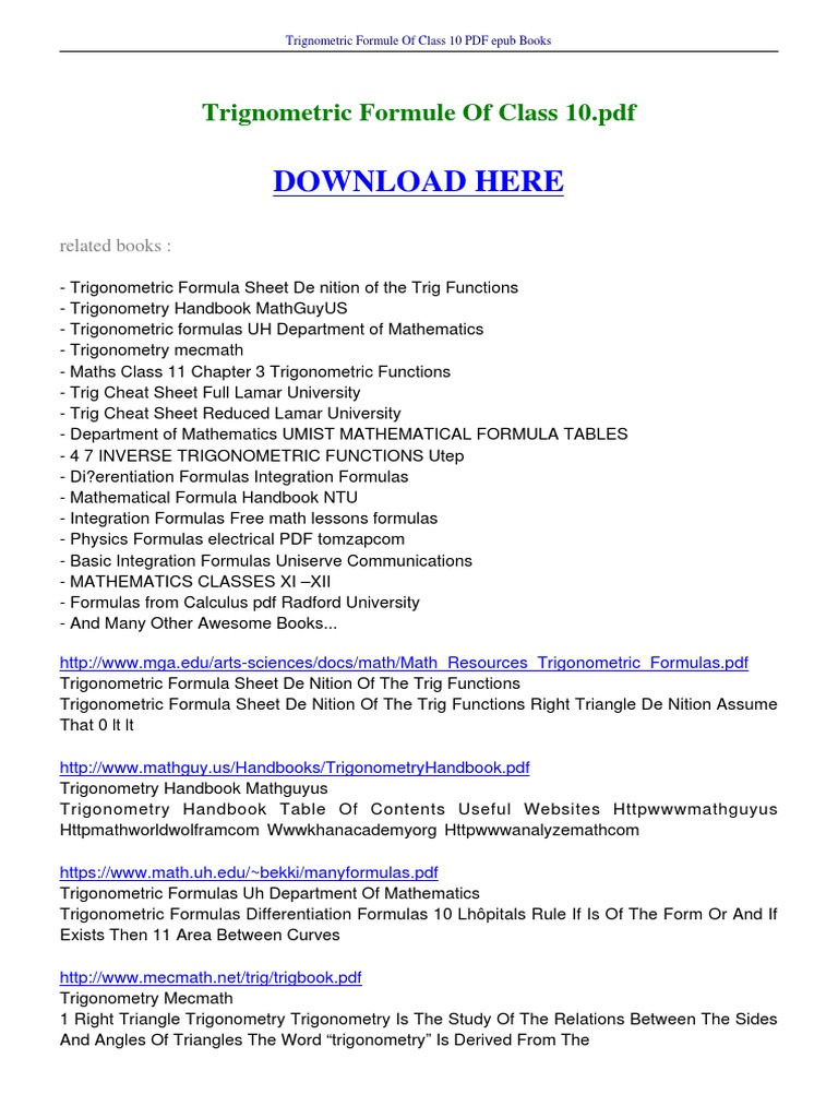 Just be sure to apply the formulae often enough that those formulae are engrained! Think creatively to discern what technique is needed to simplify an expression, or solve an equation or. Download for free (or view) pdf file ncert class 10 mathematics for competitive exams. Trigonometry formula pdf यहॉ पर उपलब्ध है, तथा trigonometry formula pdf download भी कर सकते है, नीचे हमने सभी important trigonometry formula, त्रिकोणमिति चार्ट, trigonometry sheet लेकर आए है, आपने बहुत सी परीक्षाओ मे देखा होगा की त्रिकोणमिति सूत्र से बहुत से प्रश्न पूछे जाते है। The applications of mathematics in physics and engineering. Free trigonometry questions with answers. Visit flexiprep for more files a. To get rid of this situation, students should have a stronghold on the basics of. Math handbook of formulas, processes and tricks. Maths formulas for class 10. Chapter 9 some applications of trigonometry. This ebook is a compilation of the math formulas that we highly recommend that you know for the gre. Table form of formula chart.